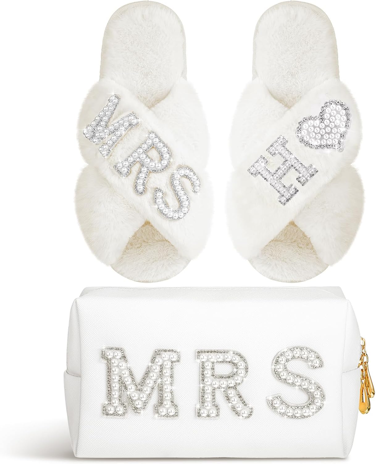 - You Will Receive: a pair of white bridal slippers with exquisite letters, and a MRS makeup bag; This combination can be an appropriate set to prepare yourself for the wedding party; You can walk around the site in our slippers and use our white makeup bag to pack some needed cosmetics