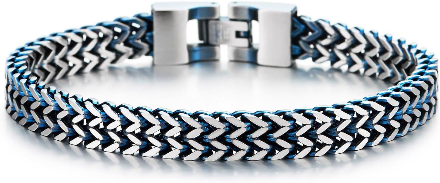 COOLSTEELANDBEYOND Men’s Blue and Silver Stainless Steel Bracelet Braided Chevron Chain Franco Curb Chain Stylish Gift