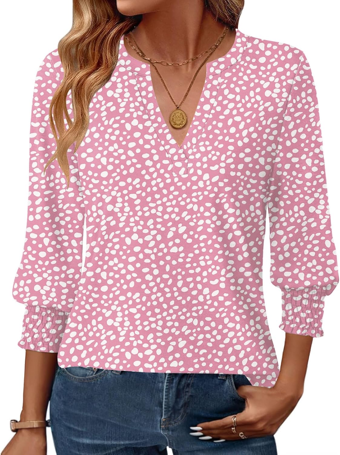 Womens 3/4 Sleeve Shirts V Neck Dressy Casual Spring Summer Blouses with Smocked Cuffs