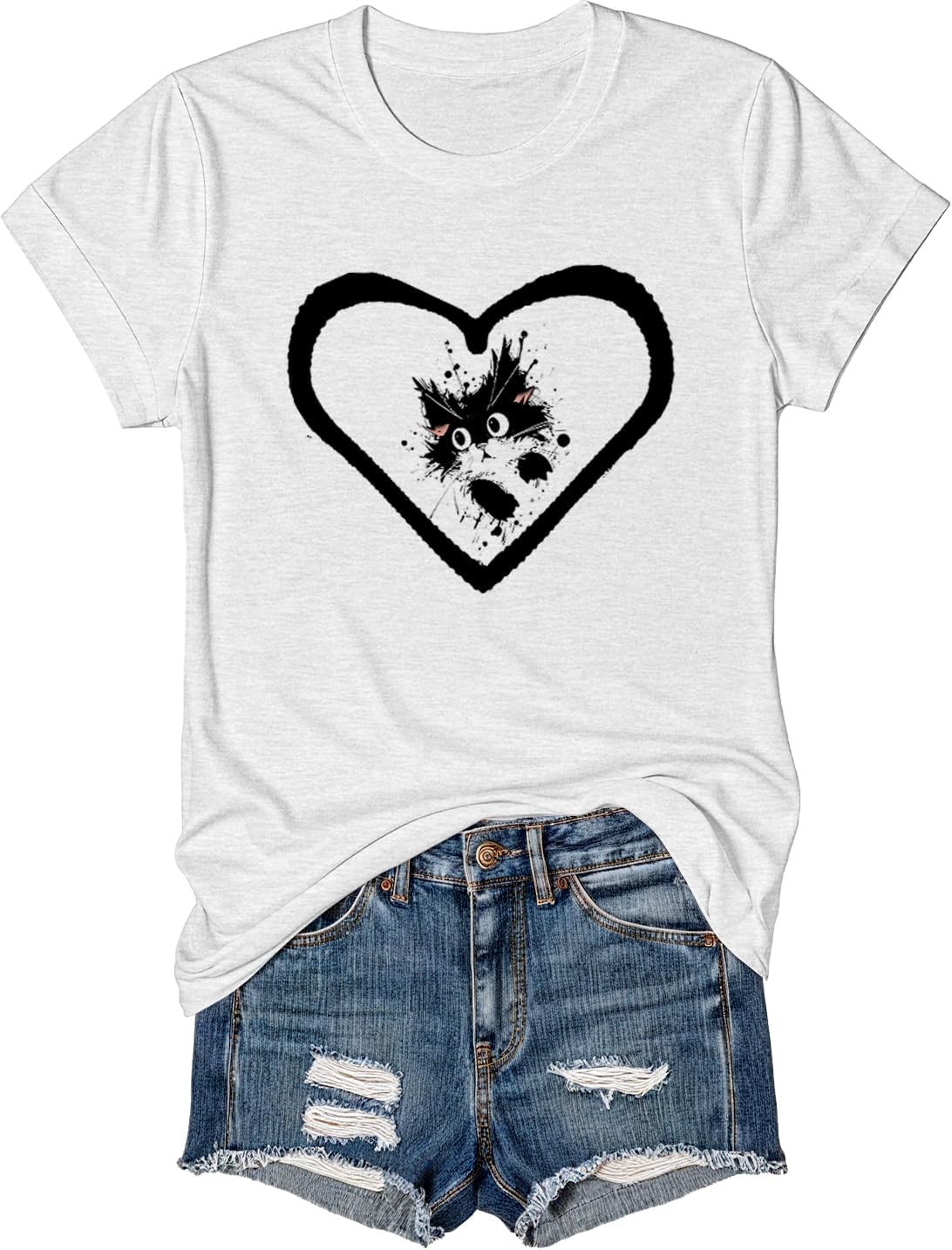 Women's Cute Cat & Heart Graphic T-Shirt-Soft Cotton Blend Fabric,Summer Casual Loose Fit Tee for Daily Wear& More