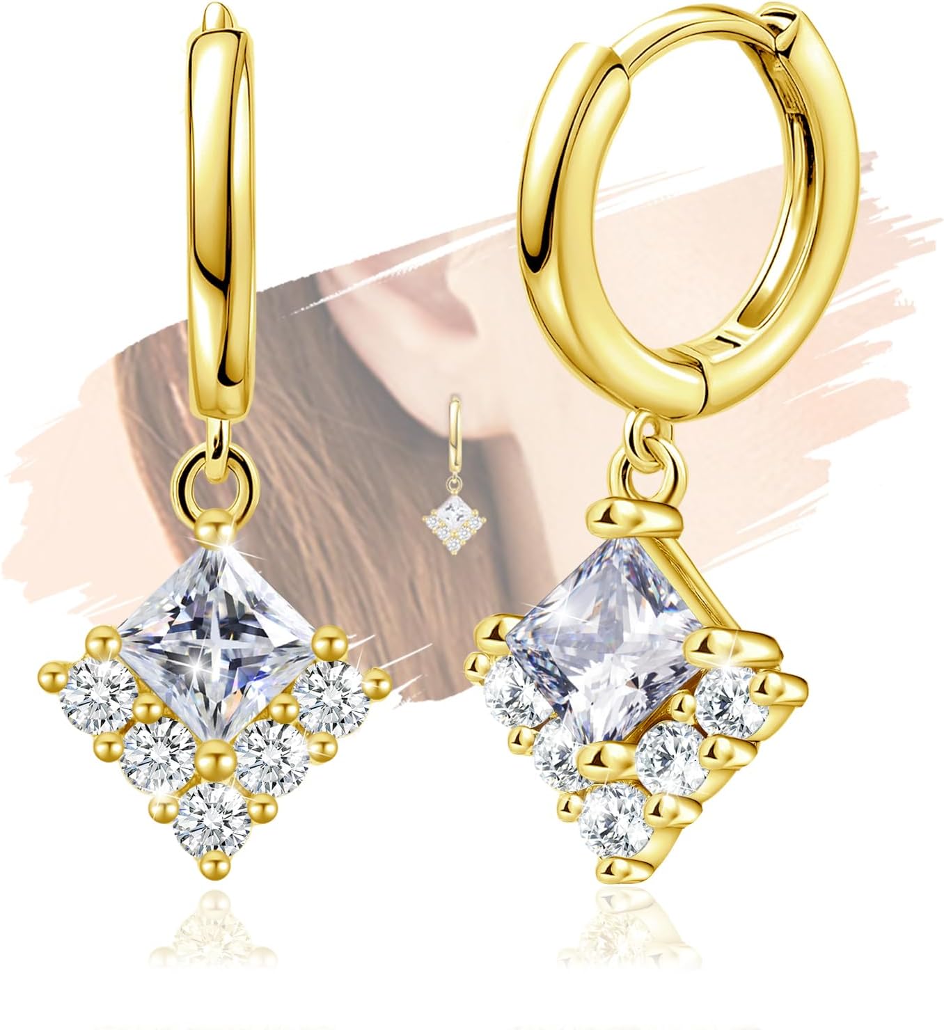 Sterling Silver Hoop Dangle Earrings for Women Hypoallergenic Sparkly Cubic Zirconia Hoop Earrings with Dangle Square Lightweight Classic CZ Small Loop Dangling Earring with Charms Gifts