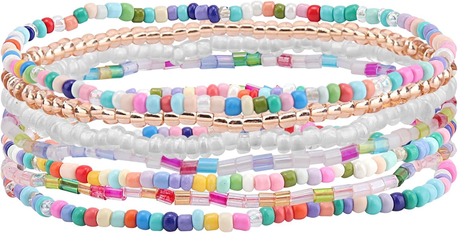 7PCS Bohemian Stackable Beaded Bracelets for Women Colorful Multilayer Stackable Crystal Bead Bracelets Boho Glass Beads Stretchy Bracelets Set