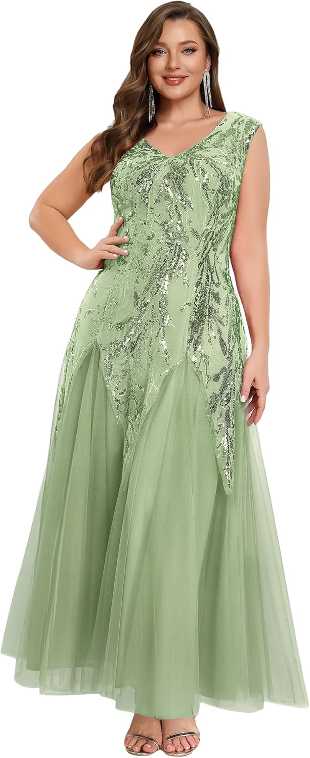Ever-Pretty Plus Women's V-Neck Sequin Plus Size Formal Evening Dress A-Line Cap Sleeves Prom Dresses Ball Gowns