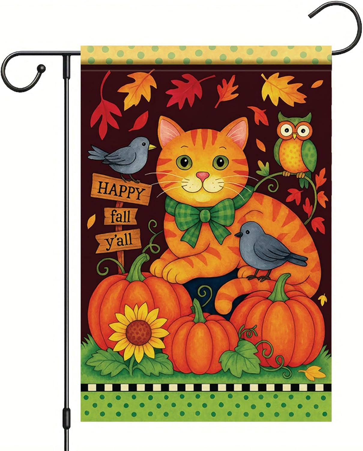 - Playful Cat Design:This fall garden flag features a cheerful cartoon orange tabby cat surrounded by pumpkins, sunflowers, birds, and an owl, with a “Happy Fall Y’all” sign for festive porch vibes.