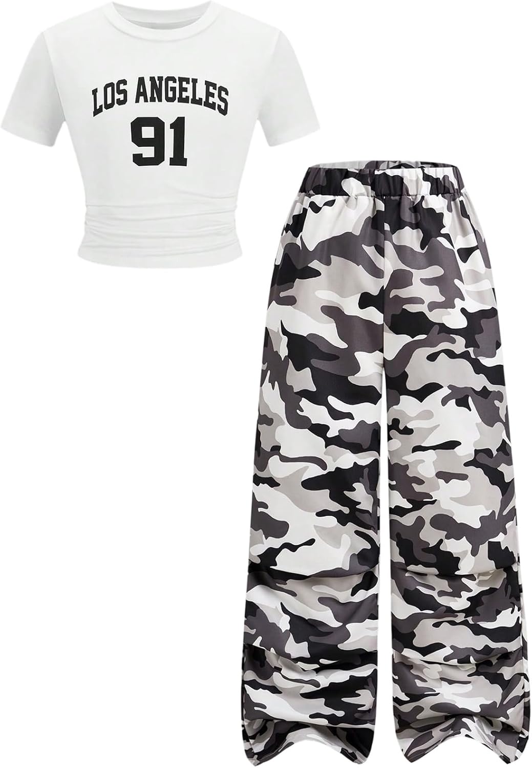OYOANGLE Girl's 2 Piece Outfits Y2K Short Sleeve Ruched Graphic Tee and Camo Cargo Pants Clothing Set