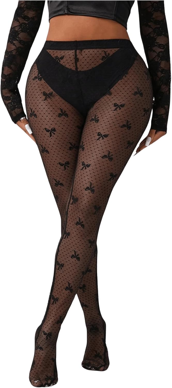 MakeMeChic Women's Mesh Sheer Bow Pattern Tights Stretchy Stockings Pantyhose Clubwear