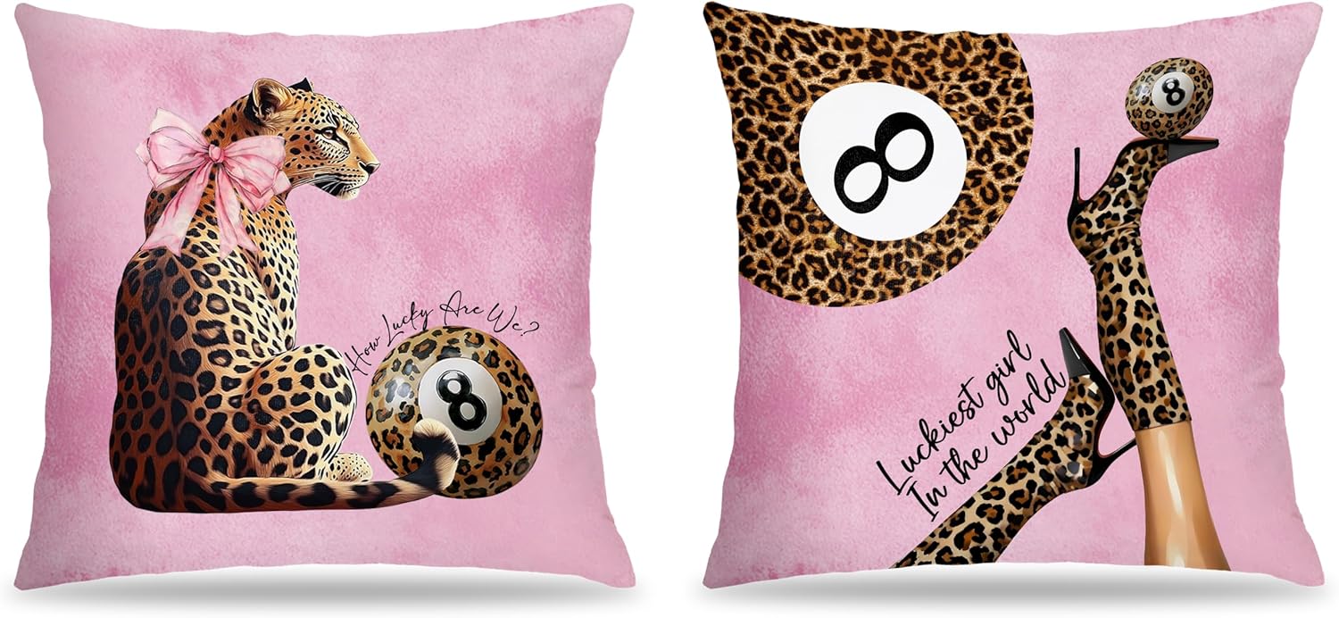 Trendy Leopard Lucky 8 Ball Cheetah Pillow Covers 18x18, Cheetah Print Room Decor, Preppy Pink Coquette Bow Leopard Boots Decorative Throw Pillow Covers for Girls Bedroom Apartment, Set of 2