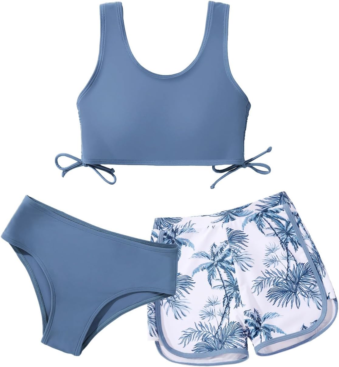 Girl's 3 Piece Bikini Bathing Suit Printed Sport Swimsuits with Shorts Cove Up Sets Teen Girl's Swimwear