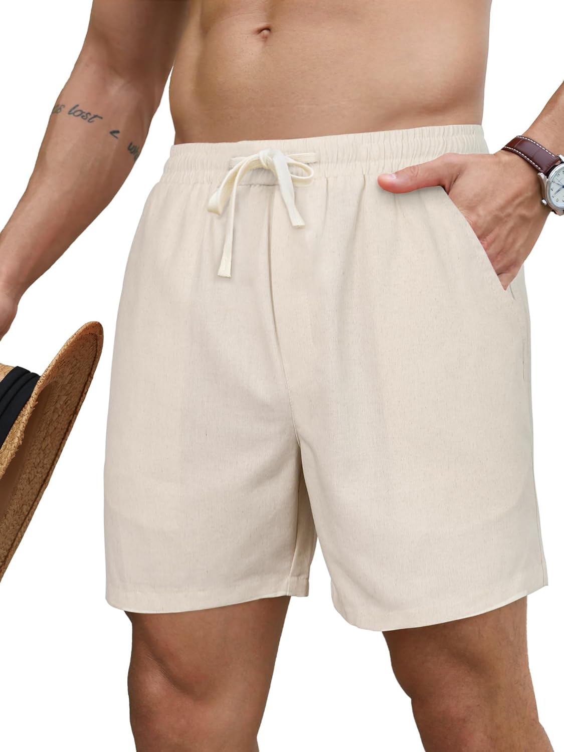 PLEPAN Mens 5 Inch Linen Shorts - Casual Elastic Waist Drawstring Summer Beach Shorts with Pocket