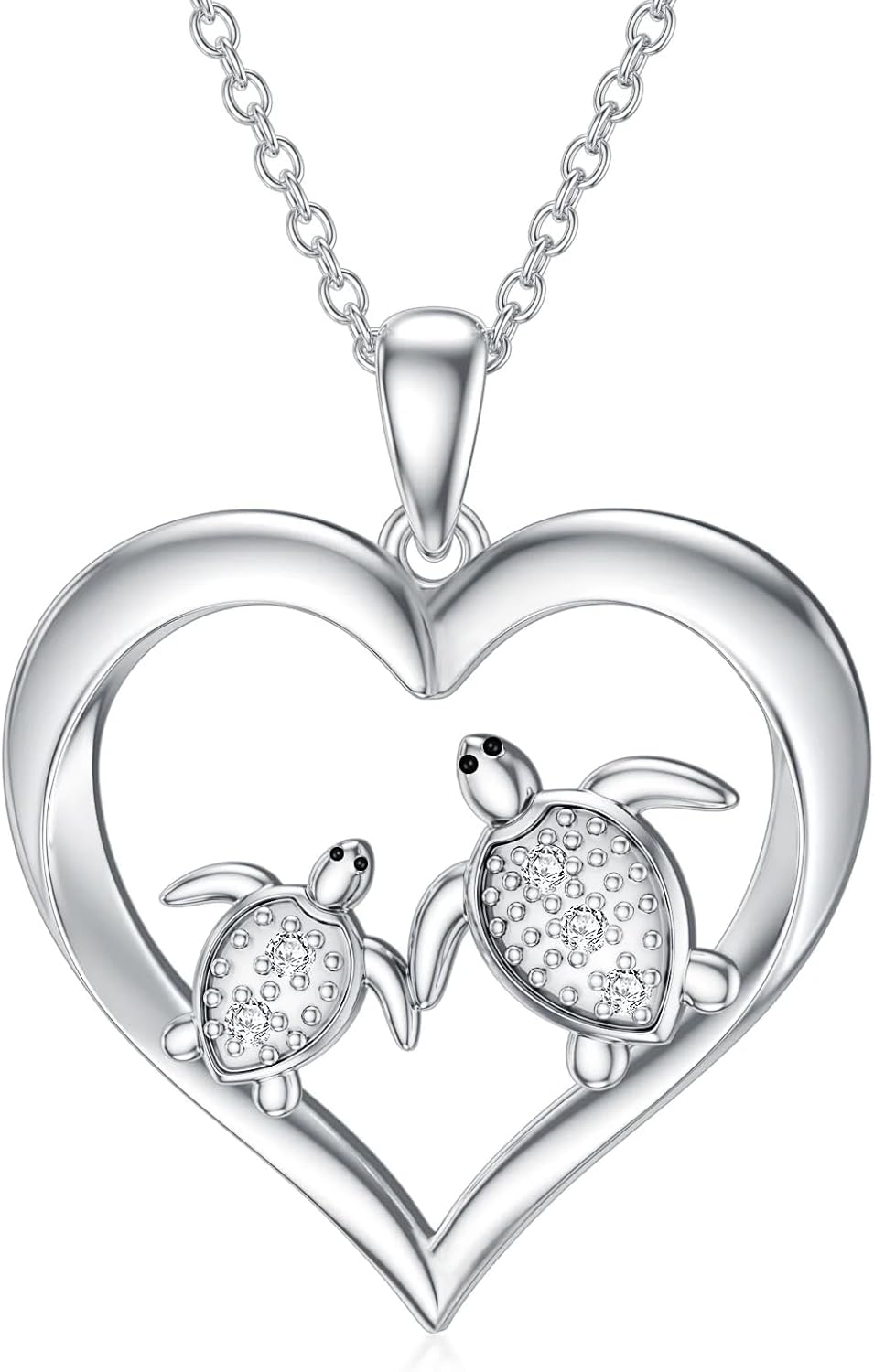 Diamond Turtle Necklace Sterling Silver Heart Sea Turtle Pendant Necklaces Lab Grown Diamond Jewelry Gifts for Mom Wife