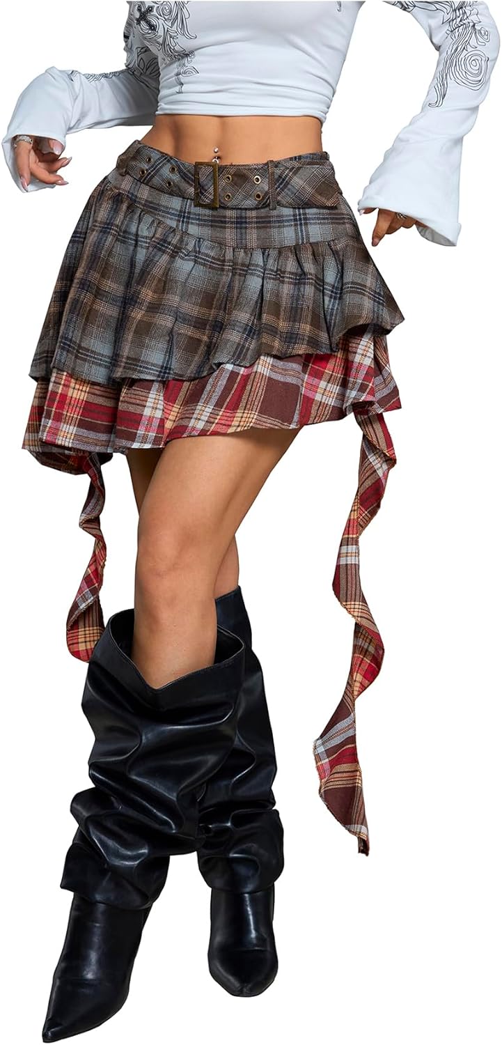 Verdusa Women's Grunge Colorblock Plaid Ruffle Skirt Y2K Tiered Layered Belted Skirt with Strap