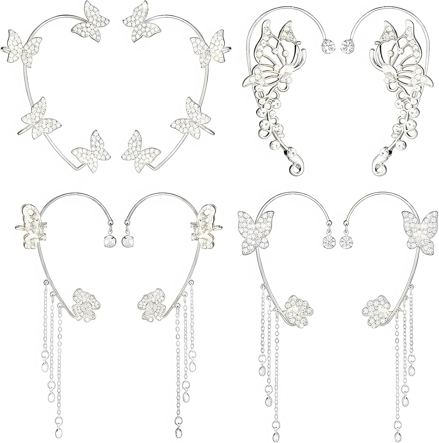 Yaomiao 4 Pairs Butterfly Earrings Ear Cuffs Fairy Costume Accessories Glitter Rhinestone Butterfly No Piercing Ear Clip for Women Girls Show, Wedding, Party, Christmas