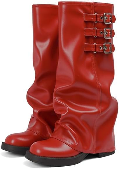 Knee High Boots Women Fall Slouchy Fold Over Tall Boots - Motorcycle, Hidden Zipper, Fashion Buckle, Platform, Square Toe