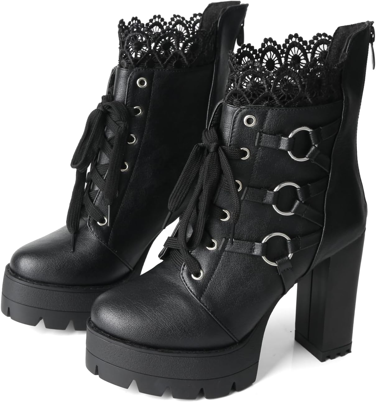 Black High Heel Boots For Women Platform Goth Chunky Heeled Boot Combat Booties Lace Up Ankle Boot with Zipper