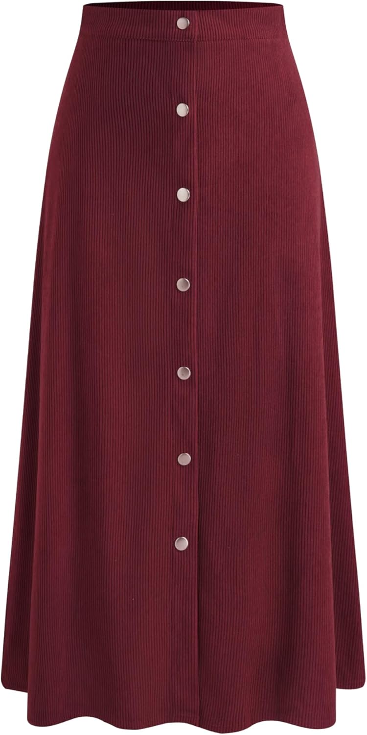 CIDER Skirts for Women Corduroy Midi A Line Ruffle Button Front Mid Waist Solid Casual Skirt