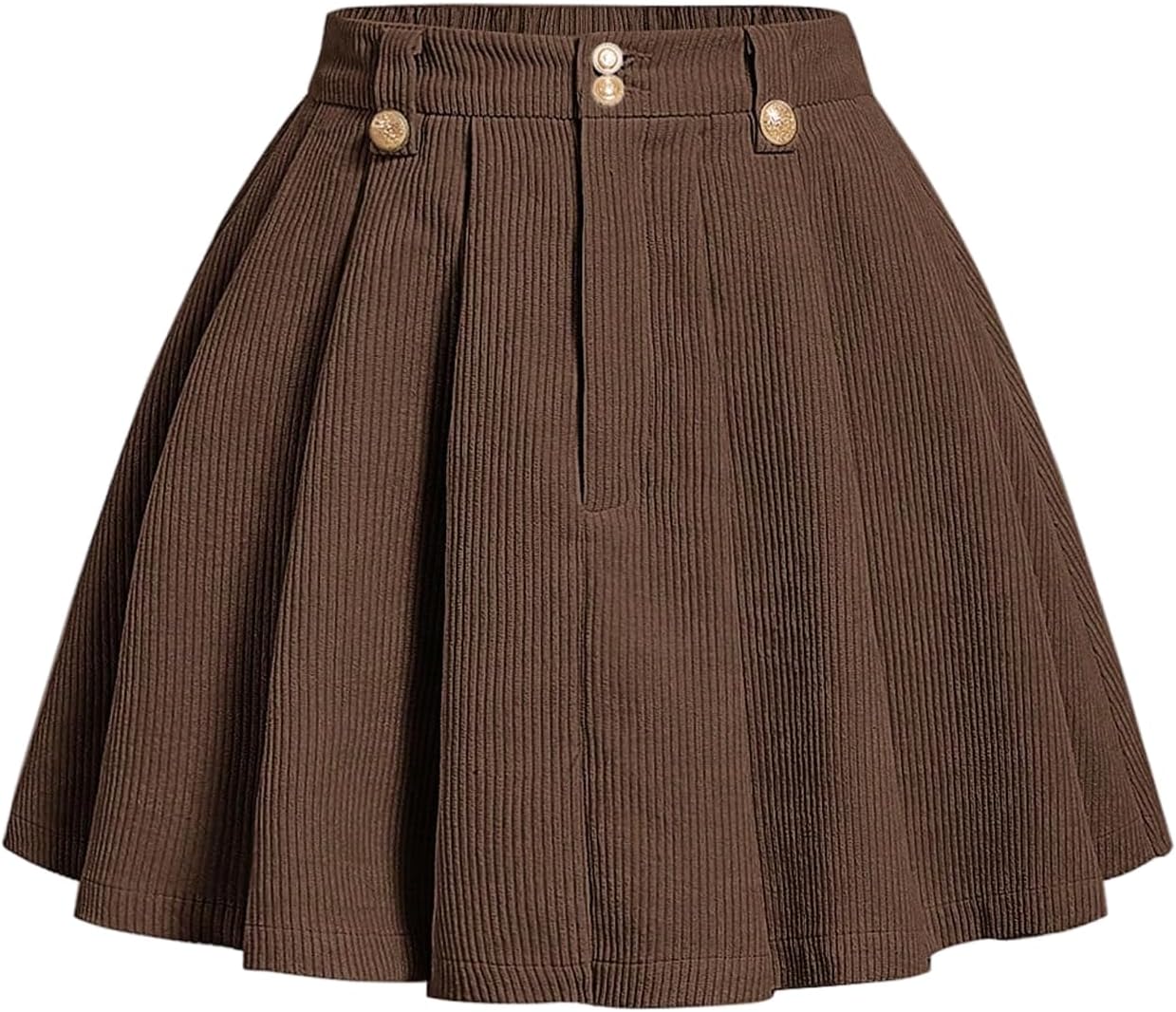 MakeMeChic Women's Corduroy High Waist Skirt Metal Button Pleated A Line Flare Skater Short Skirts