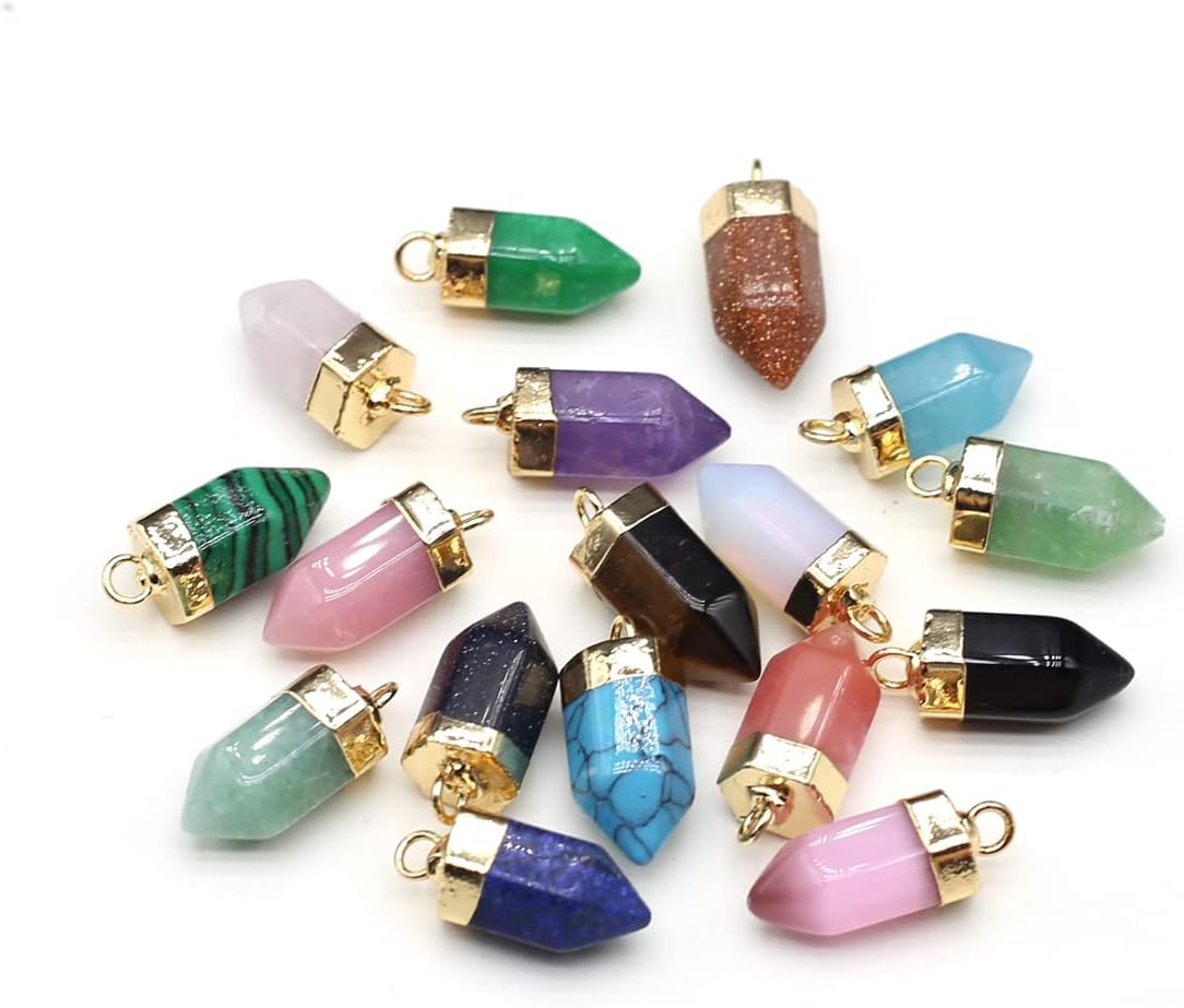 LHJ 10 Pcs Natural Stone Pendants Hexagonal Prism Shape Assorted Energy Crystal Quartz Agate Charms for Jewelry Making Neckalce