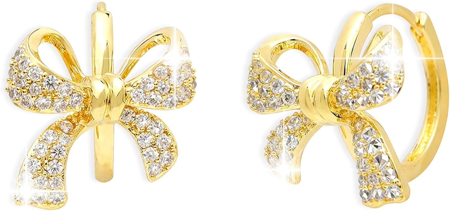 Sonateomber Gold Bow Hoop Rhinestone Earrings for Women, Cute Sparkly Cubic Zirconia Ribbon Huggie Hypoallergenic Pierced Earrings Holiday Prom Fashion Jewelry Gift
