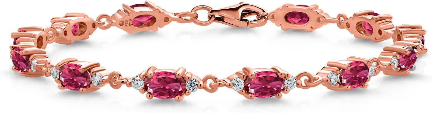 Gem Stone King 18K Rose Gold Plated Silver Pink Tourmaline and White Moissanite Tennis Bracelet For Women (6.61 Cttw, Gemstone Birthstone, Oval 6X4MM, 6.5, 7, 7.5 Inch)