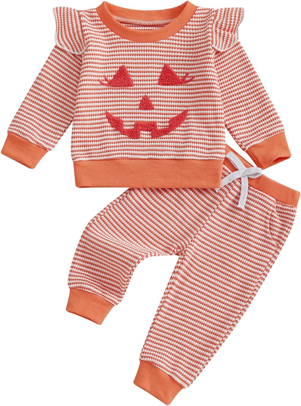 Baby Girl Halloween Outfit Cute Ruffles Waffle Pumpkin Face Sweatshirt Top and Pants Toddler Girl Fall Outfits