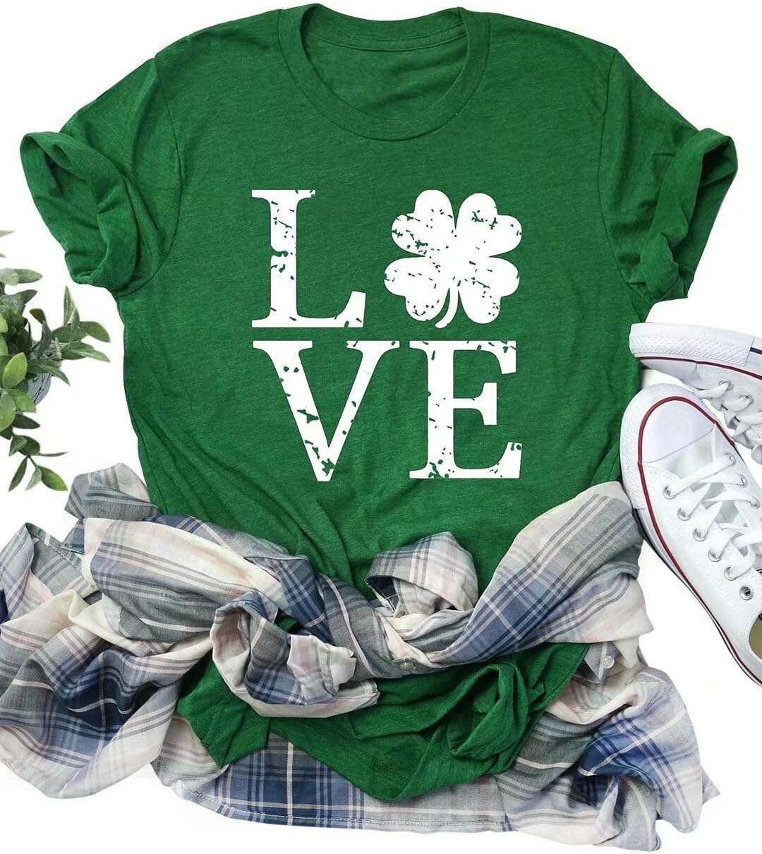 Love Shamrock Graphic St Patrick's Day Cute T-Shirt Women's Lucky Clover Irish Tees Short Sleeve Casual Tops
