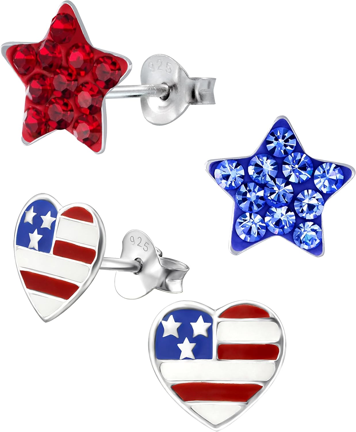ICYROSE set of 2 pairs 925 Sterling Silver American USA Flag Heart Stud and red & Blue Crystal Star Earrings (Nickel Free)