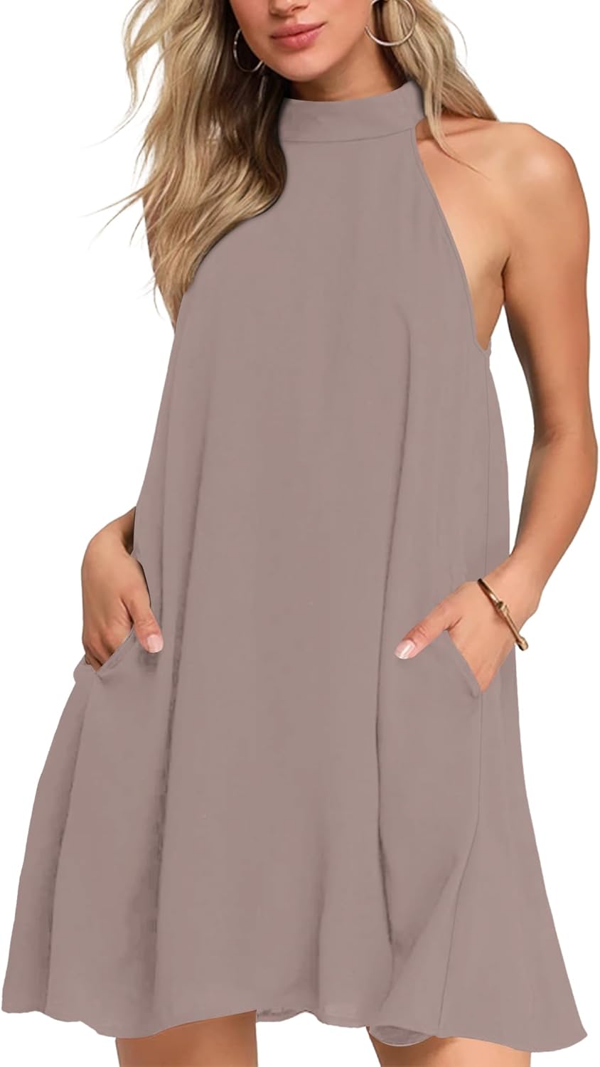 AUSELILY Womens Summer Dress Sleeveless Halter Neck Beach Dress Casual Sundresses with Pockets
