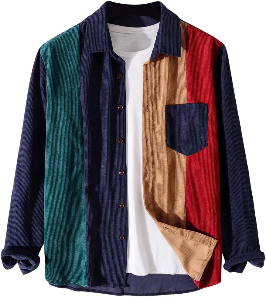 WDIRARA Men's Corduroy Button Down Long Sleeve Colorblock Shirt Collar Tops