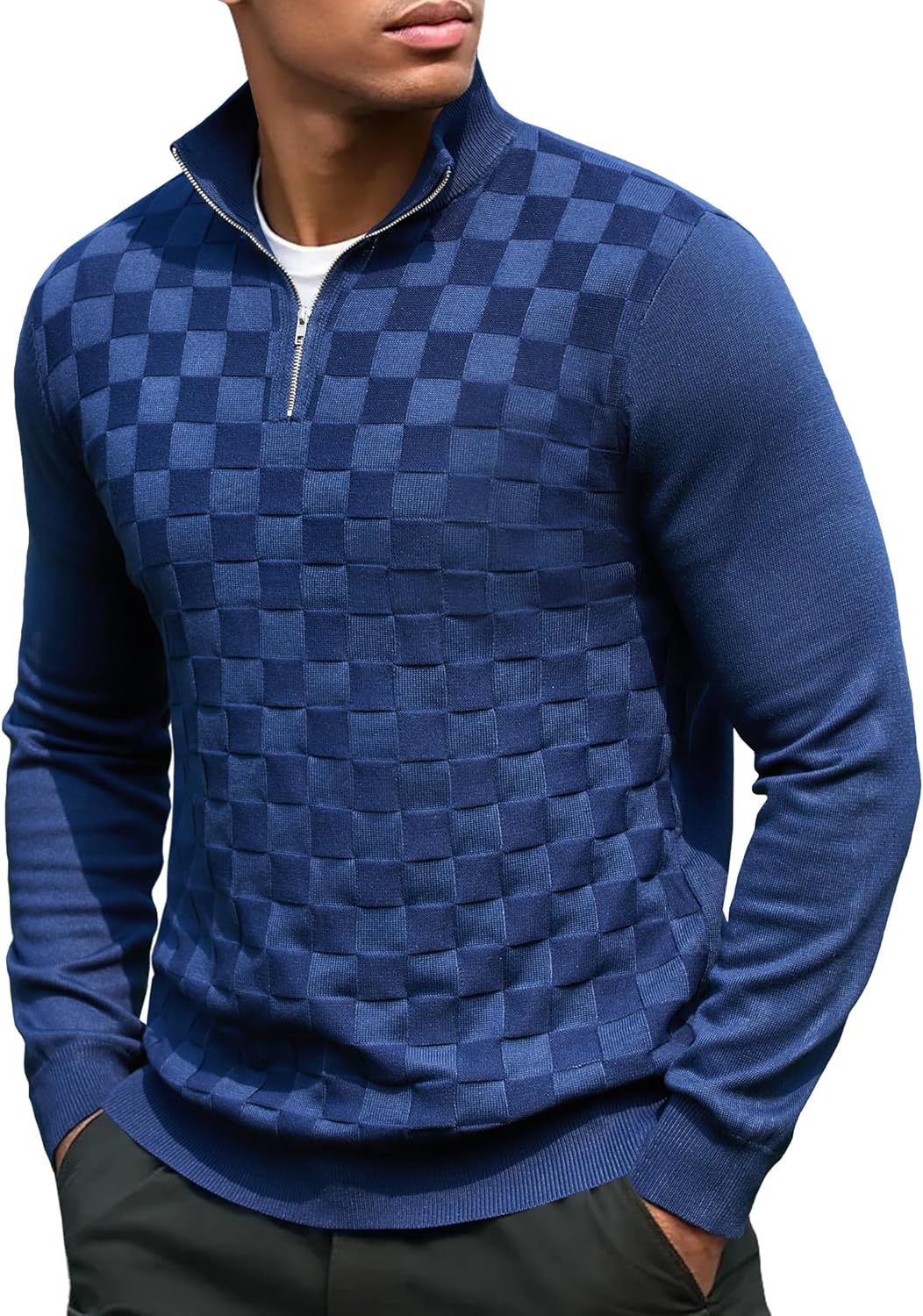 COOFANDY Quarter Zip Pullover Men Dress Sweaters Long Sleeve Jacquard Checkered Sweater