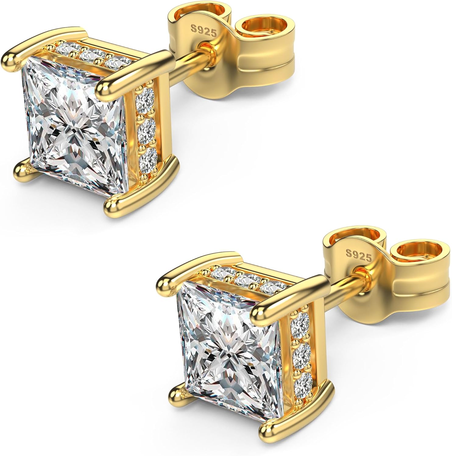 18K White Gold Plated Sterling Silver Princess Cut Square Cubic Zirconia Stud Earrings for Women Men Clear CZ Diamond Stud Earrings