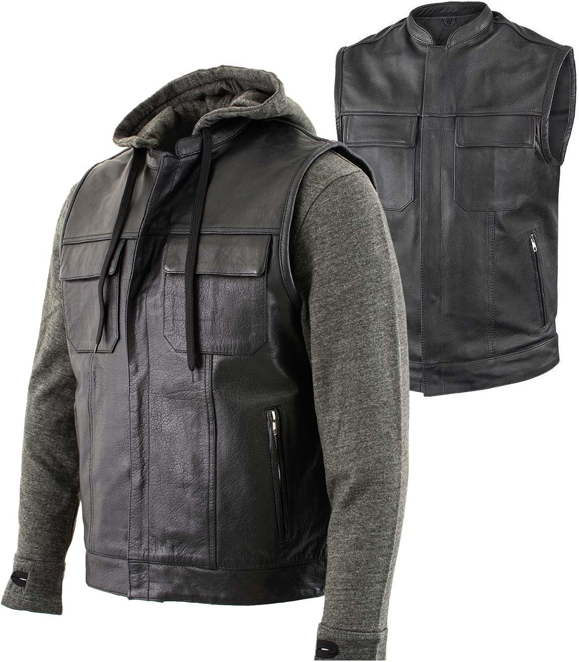 - [REMOVABLE TEXTILE HOODIE INCLUDED] Features a fully detachable textile hoodie made from soft cotton fabric. Designed with an adjustable hood, elasticized cuffs, and waistband for a snug, comfortable fit. Wear it installed for added warmth in cooler conditions or remove it for a clean, classic leather vest profile.