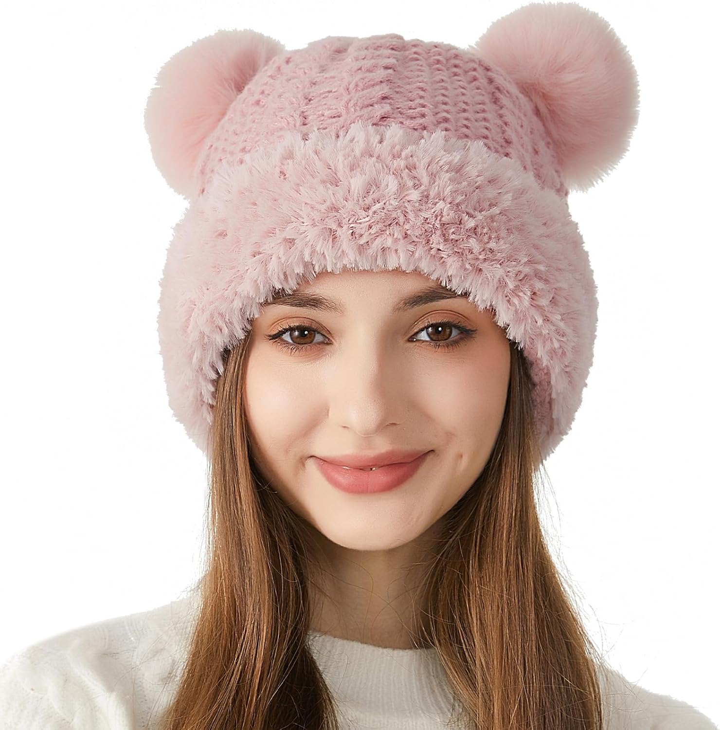 Peicees Knitted Beanie with Fur Pompom for Women Chunky Winter Beanie Hat Warm Fleece Lined Skull Cap Cute