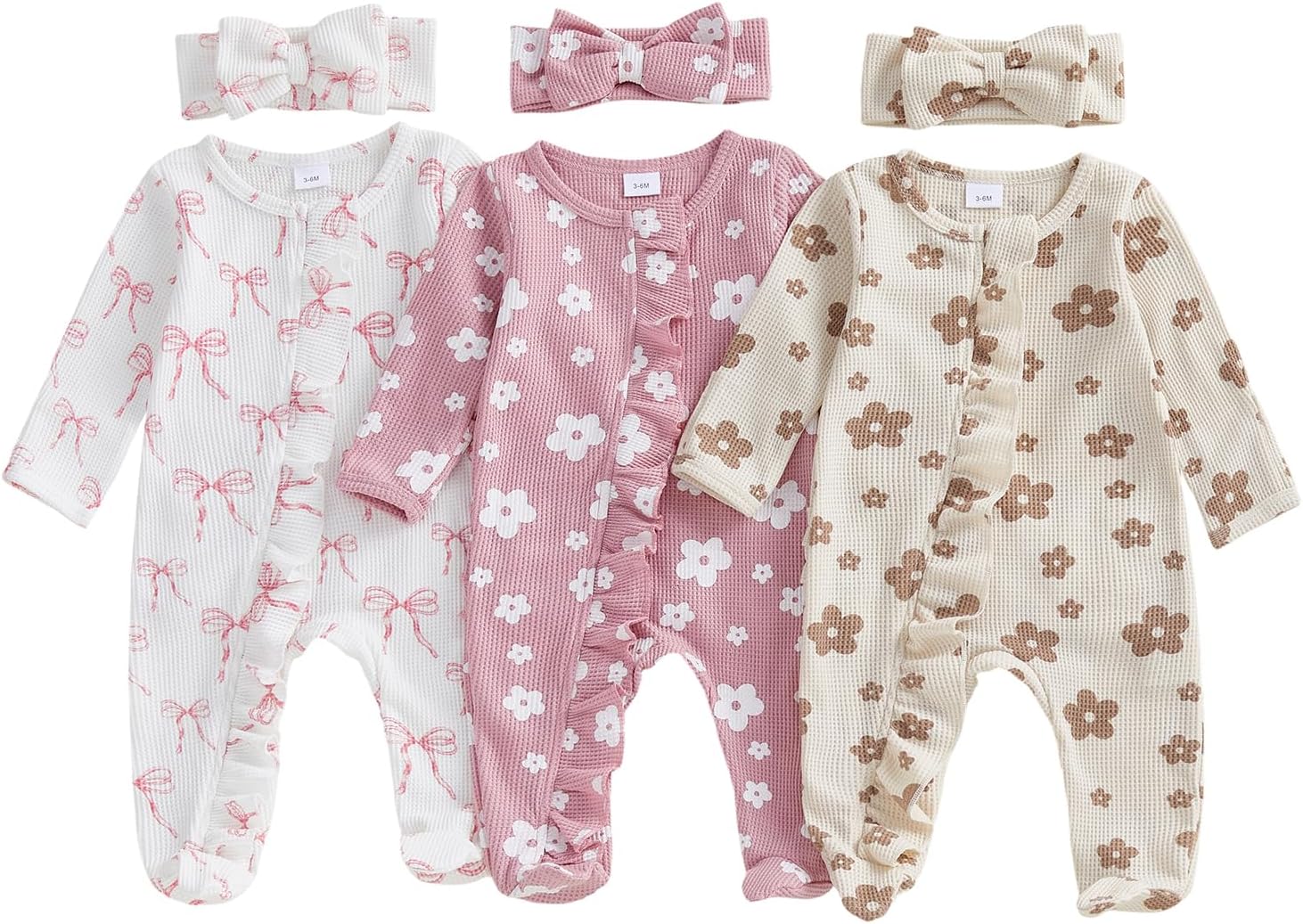 Newborn Baby Girl Clothes Bow Floral Footed Jumpsuit Ruffle Zipper Romper And Headband Cute 6pcs Coming Home Outfit