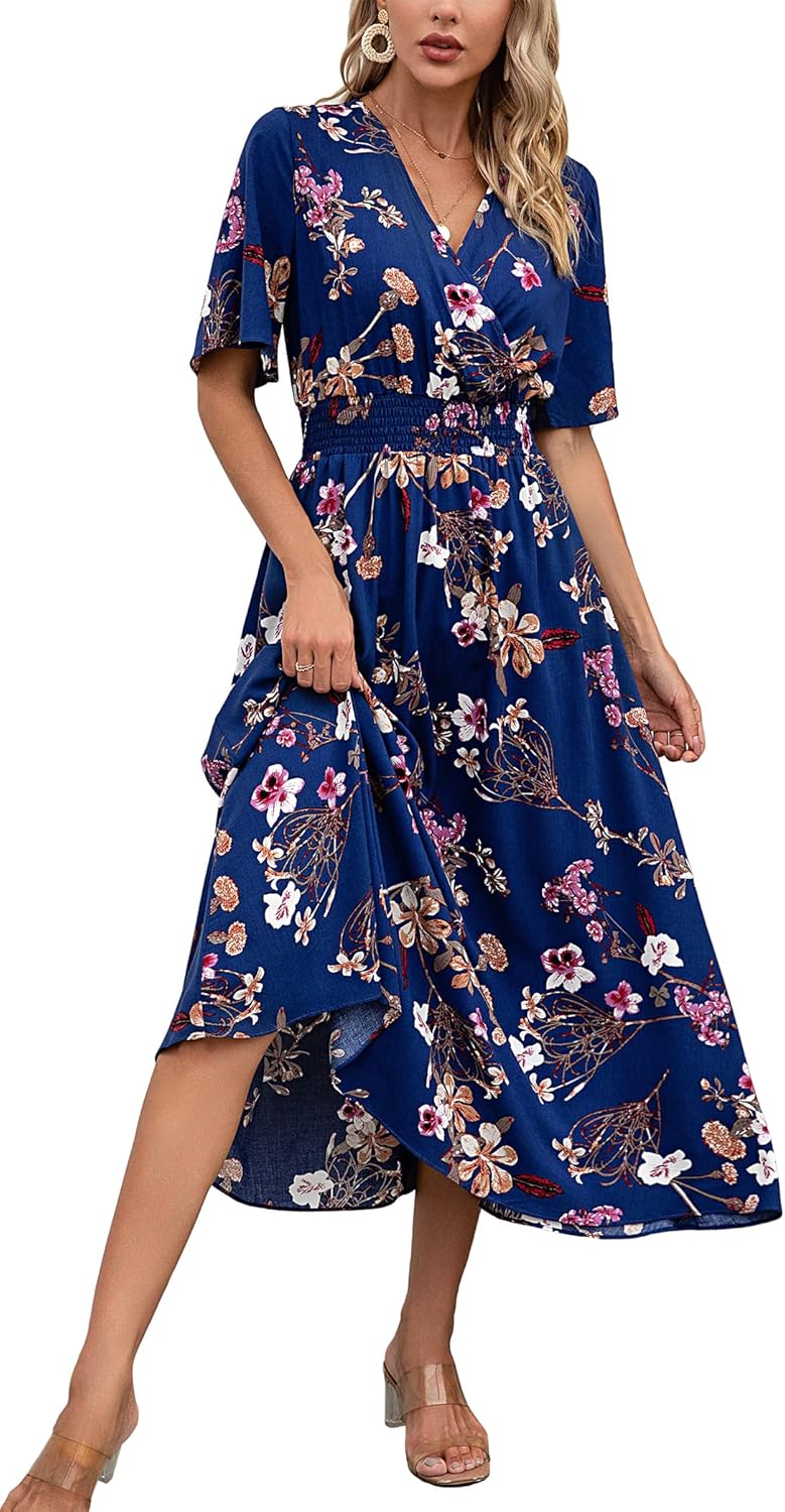 Kormei Women Short Sleeve V Neck Boho Floral Smocked Waist A-Line Swing Summer Beach Party Long Maxi Dress