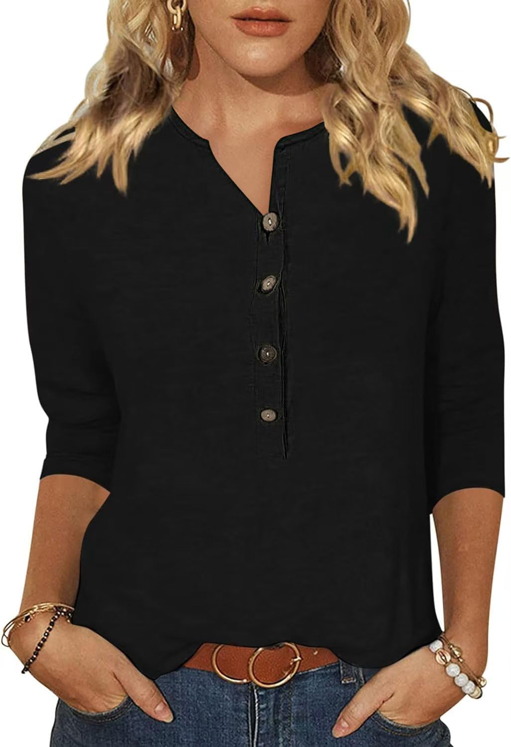 Womens 3/4 Sleeve Shirts Basic Button V Neck T-Shirts Cute Casual Tunic Tops Pullover