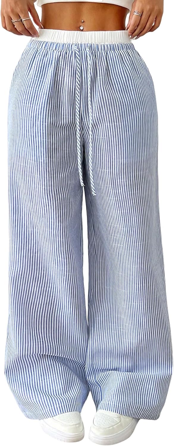 Womens Striped Pants Wide Leg Elastic High Waisted Boxer Pants Lounge Pajama Casual Trousers with Pockets