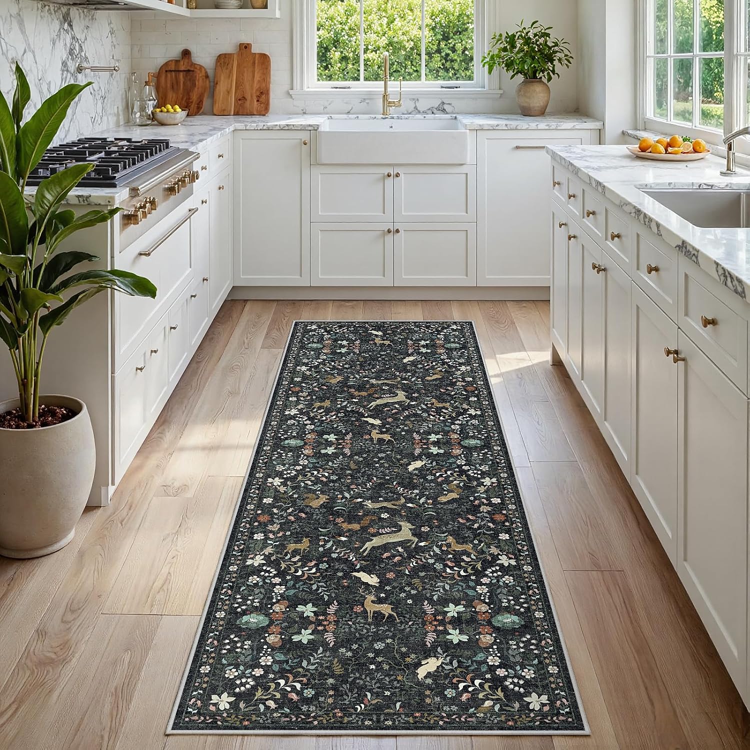 Runner Rug Washable Runners Kitchen Rugs Non Slip Neutral Floral Carpet Low Pile for Indoor Hallways Entryway Living Room Bedroom Laundry Soft Mat 2'6''x8' Black