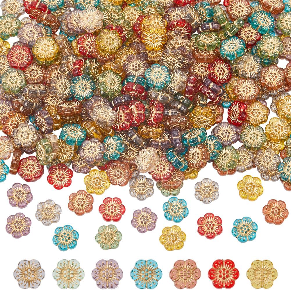SUNNYCLUE 1 Box 300Pcs Czech Flower Bead Acrylic Bohemian Beads Mix Vintage Colorful Assorted Metal Enlaced Gold Plating Cherry Blossom Floral Spacer Bead for Jewelry Making Necklace Earring DIY Craft