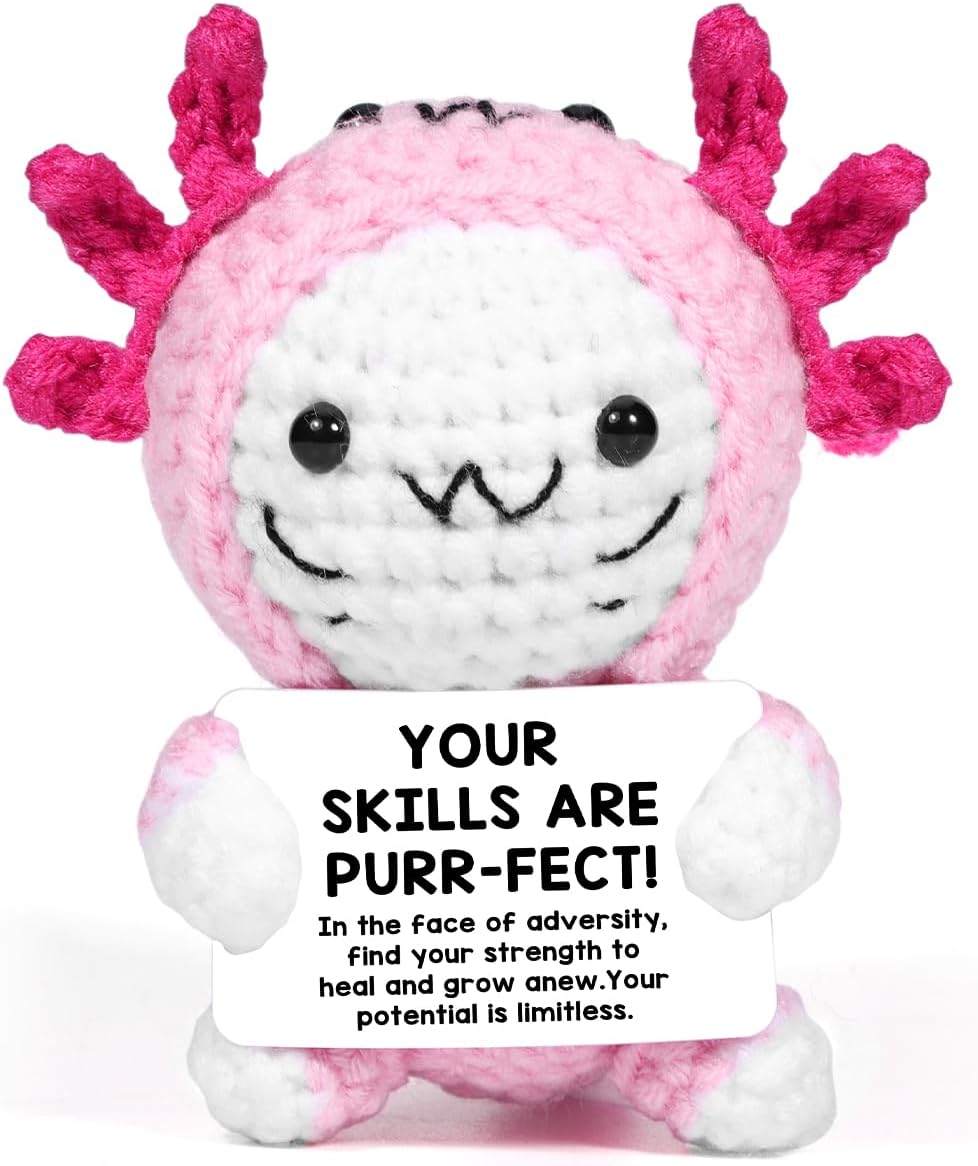 - Handmade Crochet Axolotl: This cheerful positive affirmation Axolotl to those facing difficult times or overcoming personal challenges. The positive message on the card, "Your Skills Are Purr-fect!" provides encouragement and support. Whether it's a stress relief crochet gift for a colleague or a friend navigating a tough phase, this tiny positive Axolotl will remind them to stay strong.