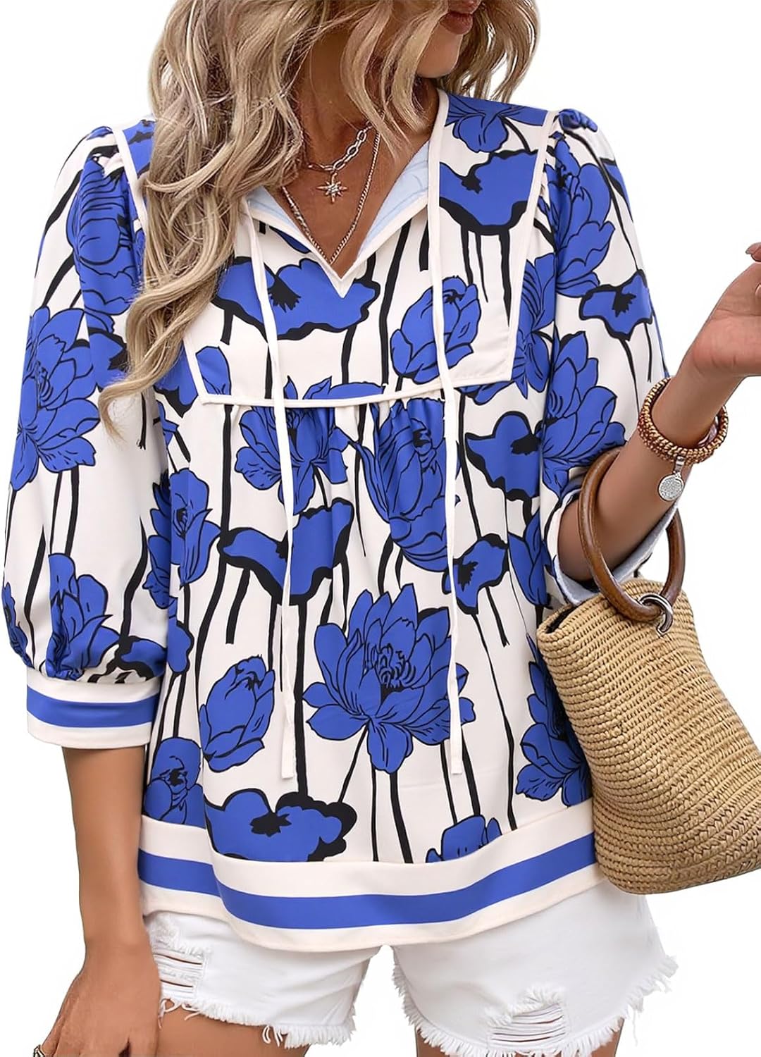 Cicy Bell Womens Floral Print Babydoll Blouse V Neck 3/4 Sleeve Peplum Tops Casual Loose Fit Boho Flowy Shirts