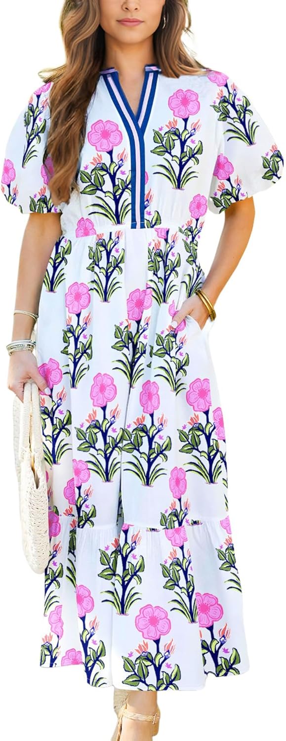 Wolddress Womens Summer Dresses 2026 Casual Puff Short Sleeve V Neck High Waist Flowy Long Maxi Dress