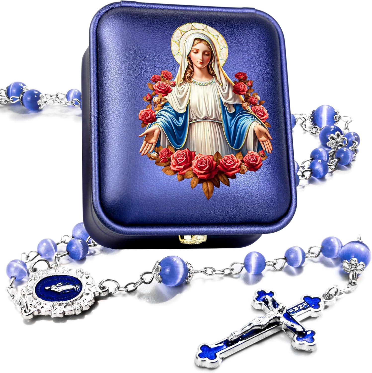 Rosary Necklace for Women - Cat's Eye Beads with Virgin Mary Medal & PU Leather Gift Box, Catholic Miraculous Medal Rosary