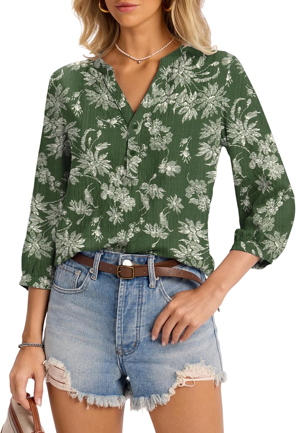 LOMON Womens Tops Dressy 3/4 Length Sleeve Henley V Neck Button Down Shirts Pleated Blouses S-XXL