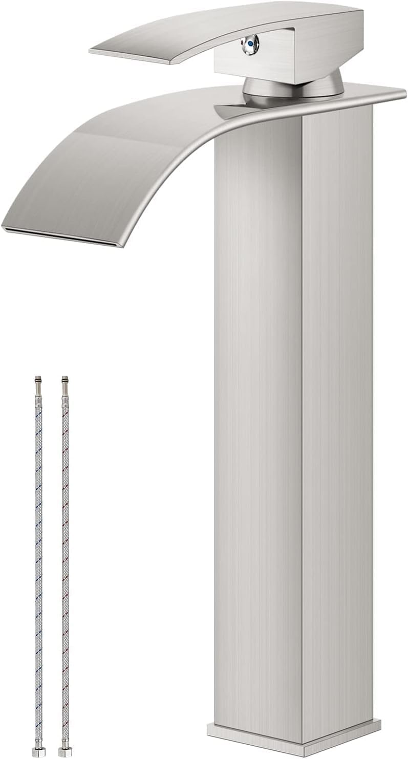 Airuida Vessel Sink Faucet Brushed Nickel, Tall Waterfall Bathroom Single Handle Single Hole, Deck Mount Mixer Tap with Large Rectangular Vessel Faucet Lavatory Vanity