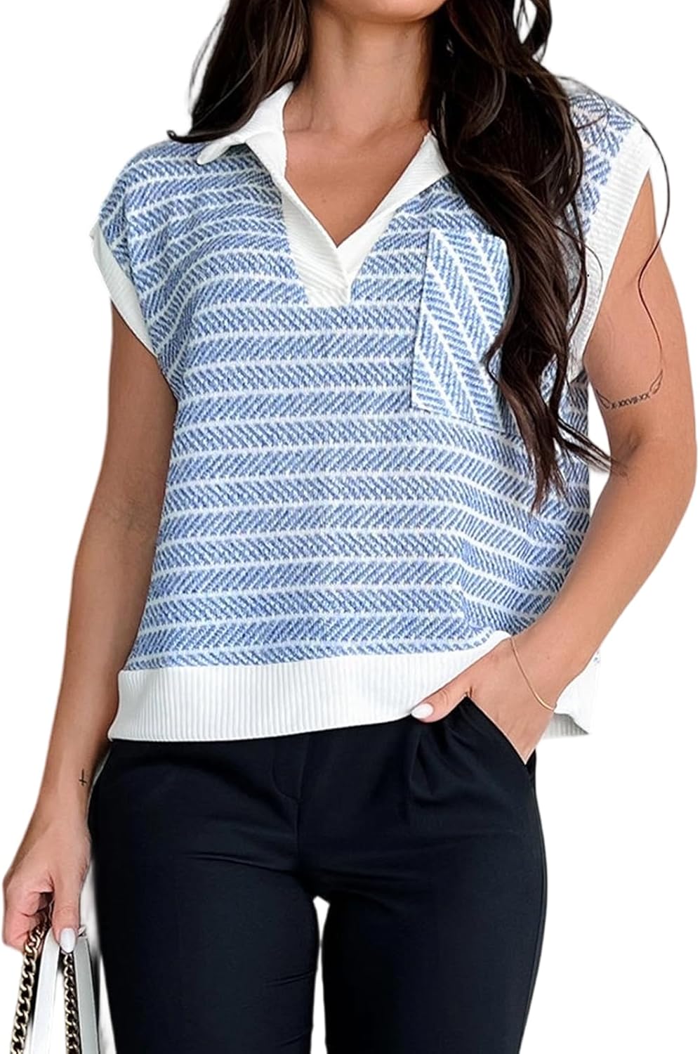 Women's Dressy Casual Tops Business Work Blouses White Striped Lapel Collar Shirts Cap Sleeve V Neck Tshirt