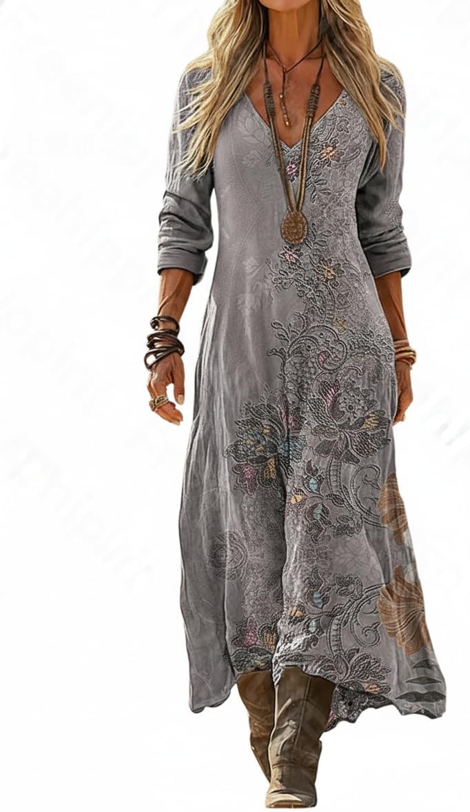 Women's Bohemian A-Line Maxi Dress, Vintage Floral Print Long Sleeve Loose Fit Flowy Casual Dress for Spring Summer