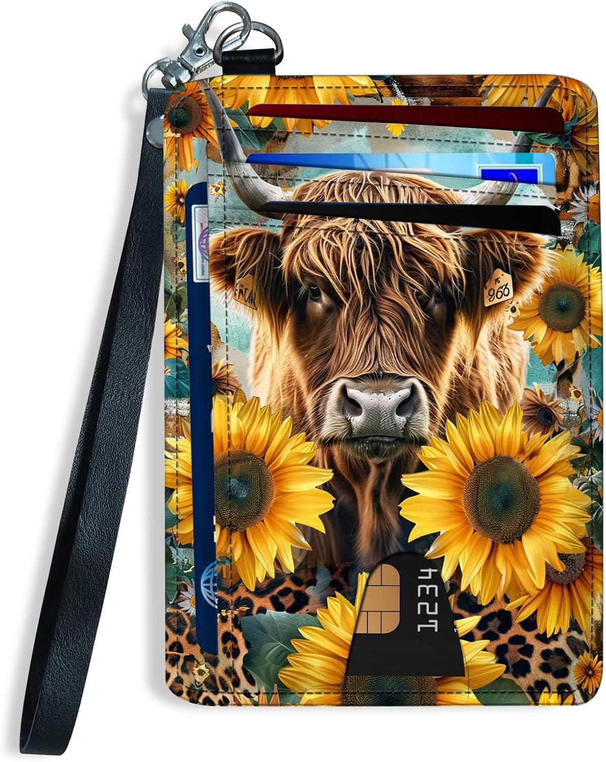 Slim Front Pocket Wallet for Women, RFID Blocking Credit Card Holder Wallet with Detachable Wrist strap, Thin Card Case ID Window Small Card Holder for Unisex, Sunflower Highland Cow