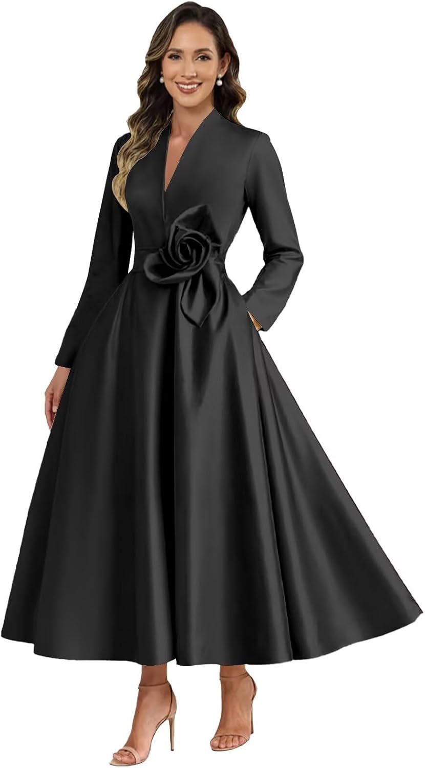 A Line Satin Mother of The Bride Dresses for Women Long Sleeve Flower Puffy Ball Gown Wedding Guest Dress with Pockets