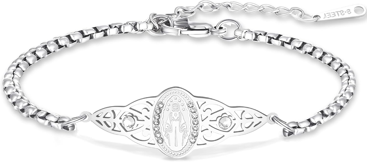 VASSAGO Virgin Mary Bracelet for Women Stainless steel Dainty Virgen de Guadalupe Rosary Jesus Cross Charm Link Bracelets Catholic Crucifix Christian Religious Baptism Gift