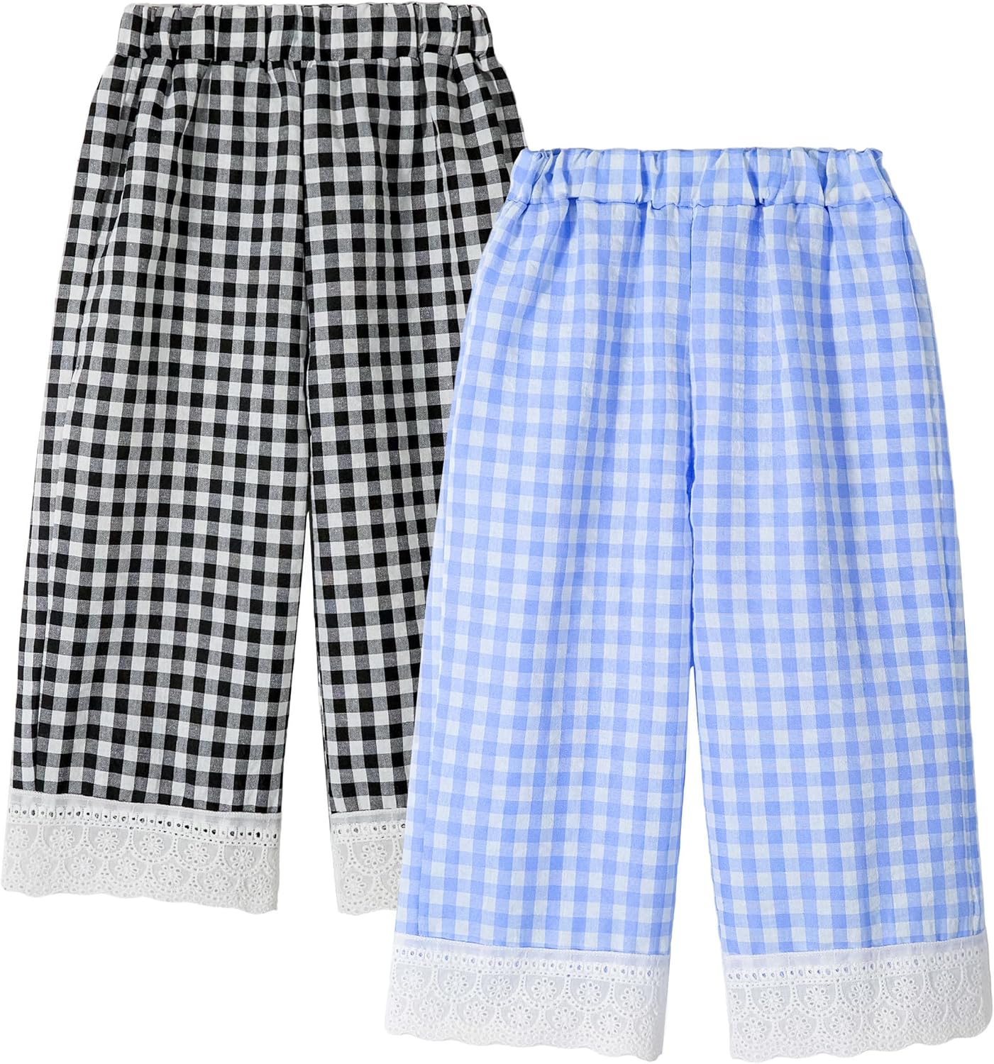 Miipat Toddler Girls Wide Leg Pants Elastic Waist 2 Pack Gingham Pants Kids Loose Checkered Plaid Lace Bottoms